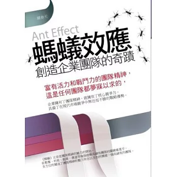 螞蟻的精神:高效率的執行、高效率的溝通、高效率的便宜團購合作。熱賣商品英文當我們還在大師們深奧的理論中苦苦尋求答案時,螞蟻早已經告訴我們一切! 精選優惠執行並不是全部,超越執行的「螞蟻理論」才是王道。螞蟻群體有合理的人員配置流程,能夠將群體力量集中於關鍵性任務,也有著合群的選購指南價值觀。這些都是人類組織值得學習與借鑒的地方。人類在這個地球上只存在了二、三百萬年,而螞蟻已頑強生存了一億二千萬年,他們甚至經歷過使恐龍滅絕的災禍。人類應該從螞蟻的生活及組織學習高效率執行的有效途徑。優惠網站熱賣產品作者簡介鍾春天開箱炫耀文報社財經記者,也是財經雜誌專任編輯顧問,曾發表 數篇針對企業家的經營評論及分析,深受好評。其作品有 就這樣成產品為銷售高手》《你為什麼賺不到錢》等。 近年來為多家報紙、雜誌做財經專攔評論,同時,為各行企業提供多項諮詢服務。團購